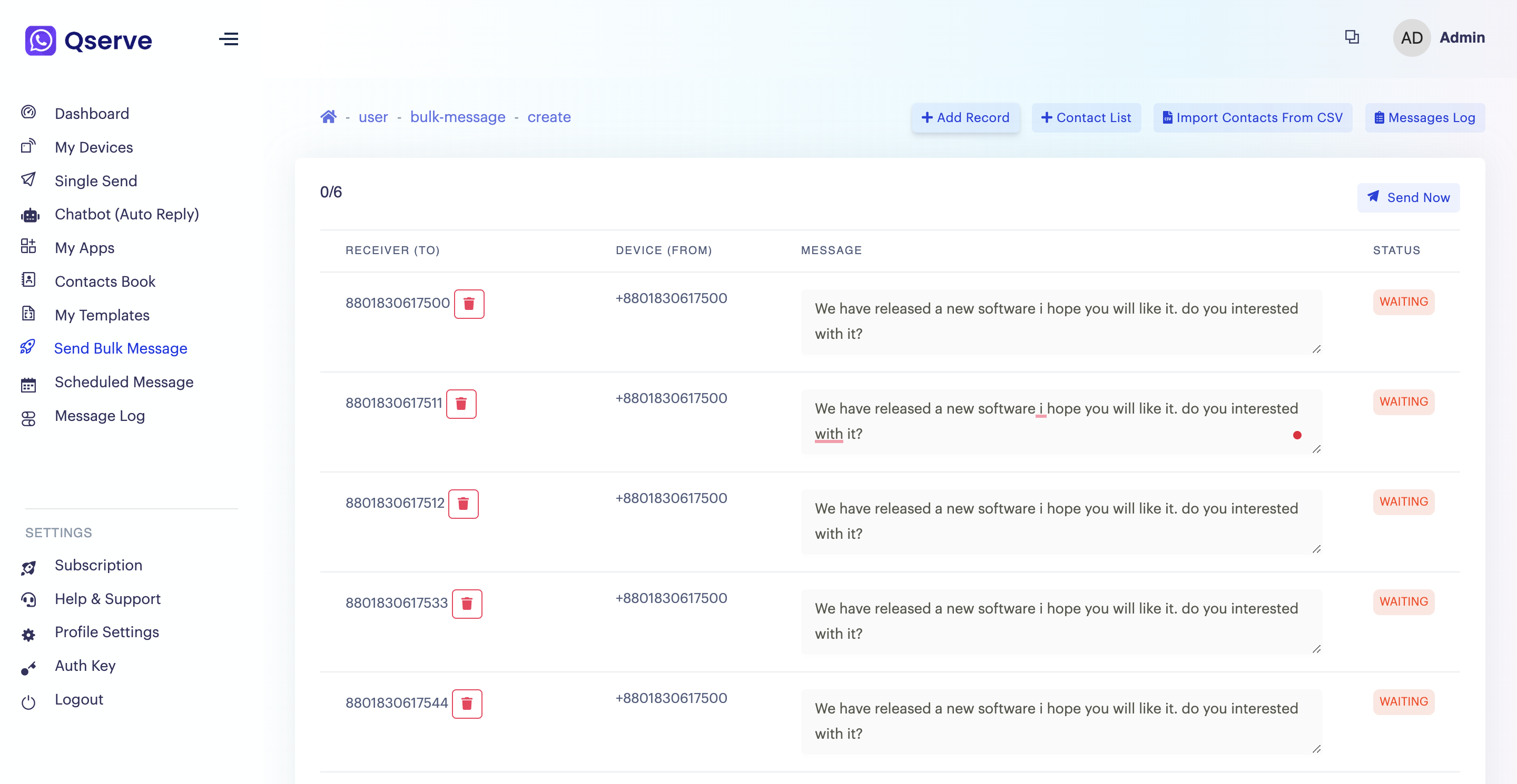 La mensajería masiva de WA consiste en la difusión de grandes cantidades de mensajes para su entrega al software WASender. Es utilizada por empresas de medios, bancos y otras empresas, así como marcas de consumo, para diversos fines, como entretenimiento, marketing empresarial y móvil.